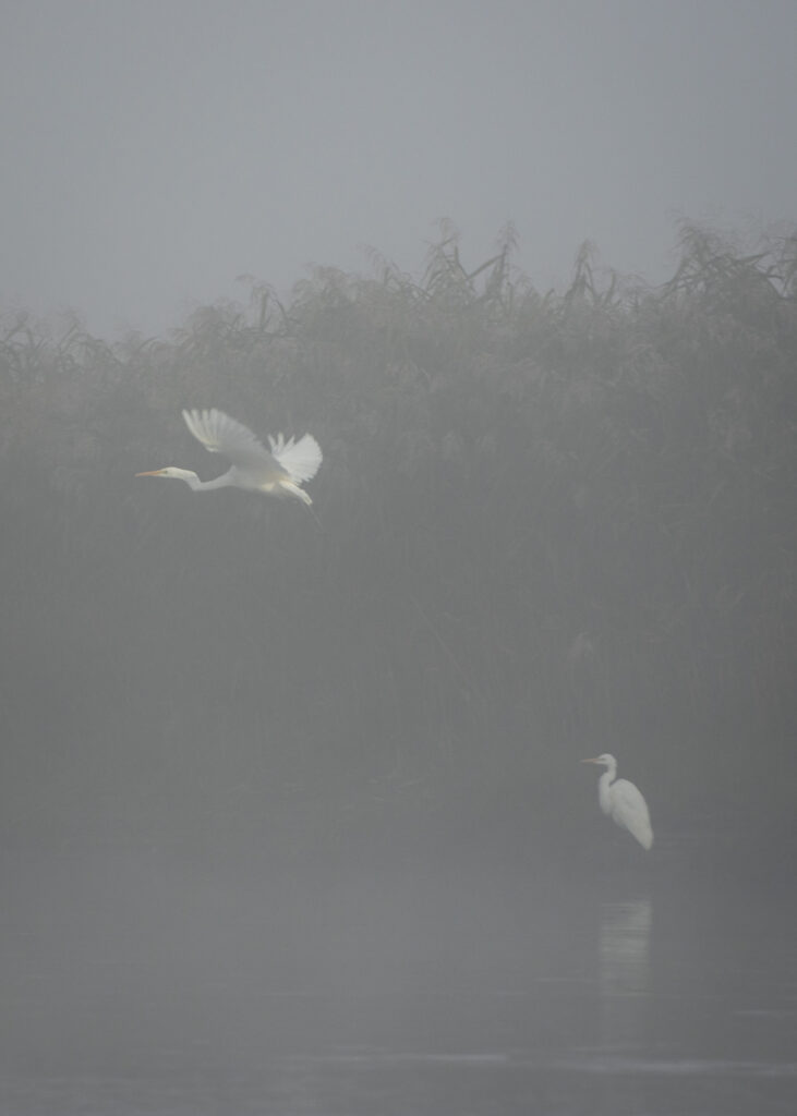 背景の葦原と霧で幻想的な雰囲気になりました。