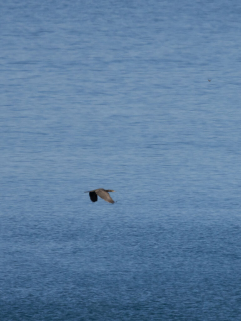 水深のある海岸沿いでの飛翔をとらえました。周囲にはカモメ類やウミウも混じっていましたが、本個体は明らかにカワウと判断できました。