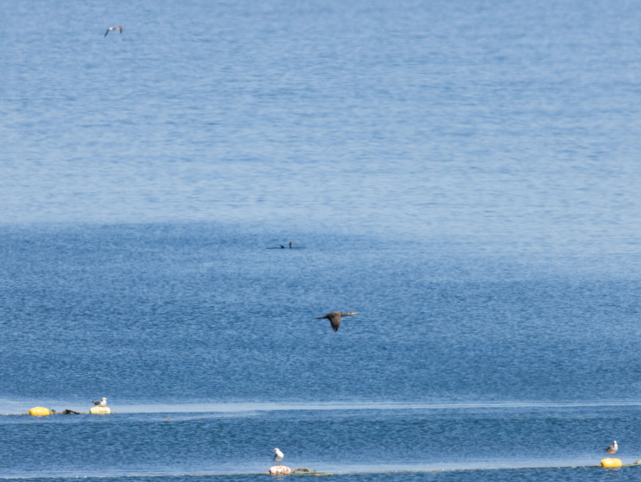 水深のある海岸沿いでの飛翔をとらえました。周囲にはカモメ類やウミウも混じっていましたが、本個体は明らかにカワウと判断できました。