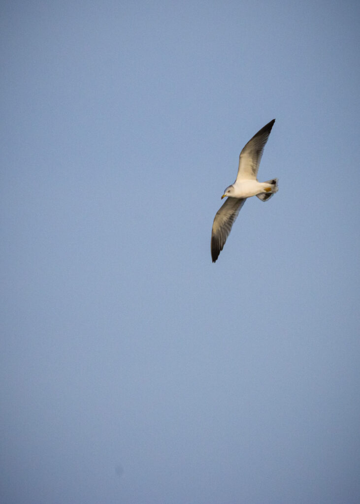 全長40cmほどの中型のカモメ。冬羽は頭部が白く、目の後ろに小さな黒斑が入るのが特徴。翼先端の黒色が目立ち、滑るような飛翔が美しい。北海道では秋から春にかけて見られ、港や河口、湖沼で群れで休む姿が多い。夏羽になると頭部が黒く変化し、季節によって姿が大きく変わる。