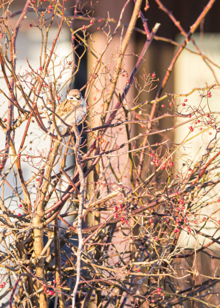 頬の黒い斑紋が特徴的な、日本で最も身近な野鳥の一つ。人里近くを好み、地上を跳ね歩きながら餌を探す姿がよく見られます。今回の写真のように、冬場に羽を膨らませて丸くなっている姿は「ふくらスズメ」と呼ばれ、親しまれています。