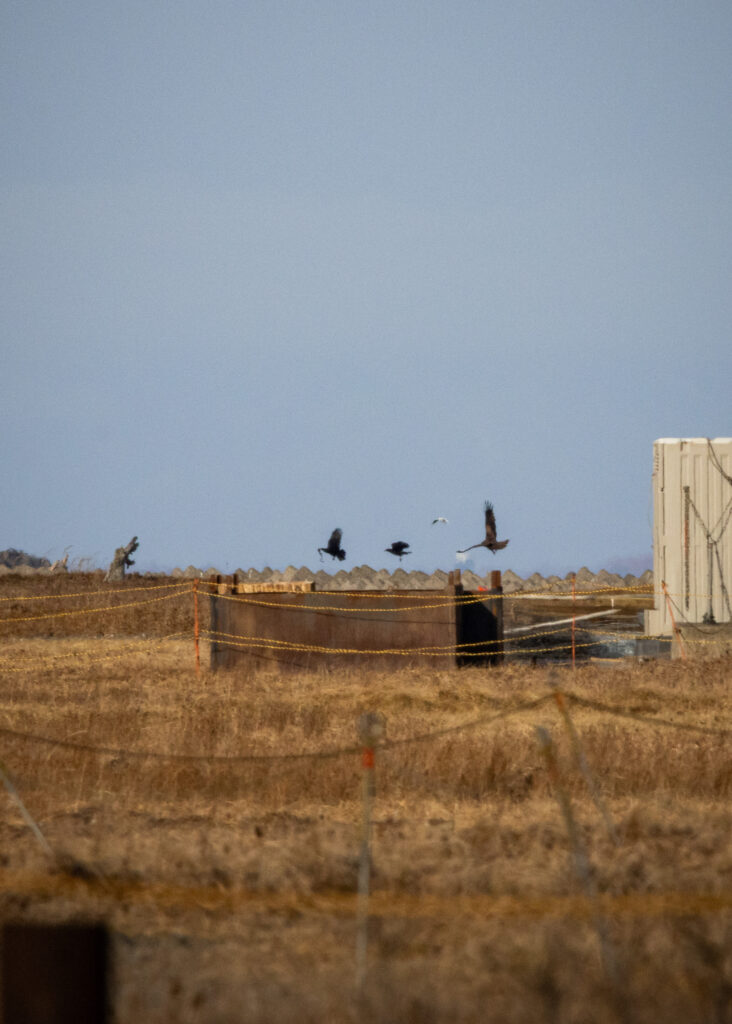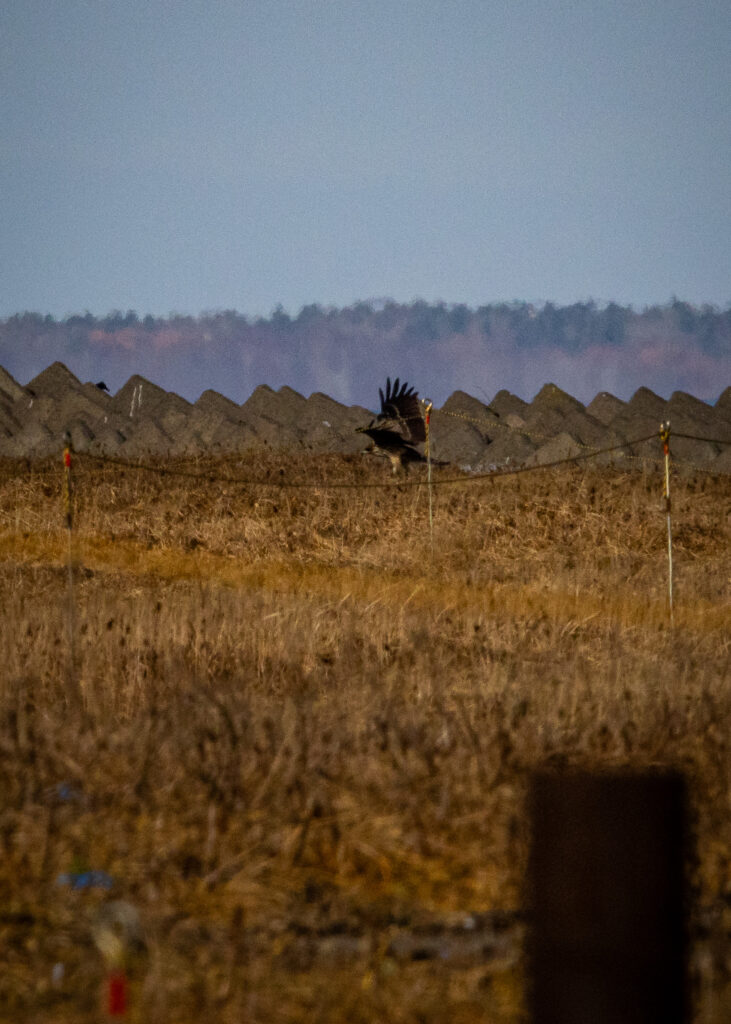 この写真は海岸沿いの防波堤近くで撮影。霧の中、杭の上に止まり周囲を見渡していました。背景の消波ブロックと霧が、オジロワシの力強さと静けさを引き立てています。