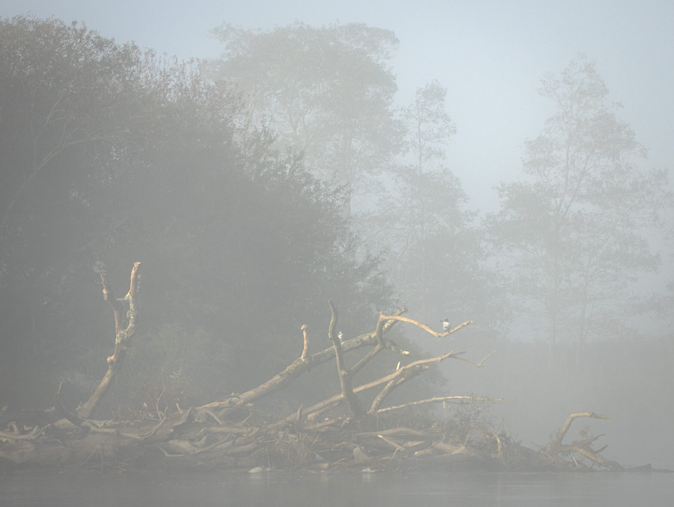 流木の上でじっと川面を見つめているヤマセミを観察しました。